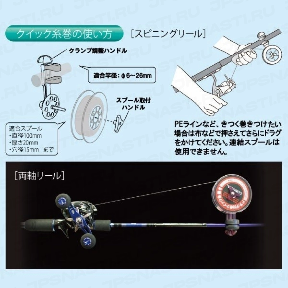 Lumica Line Spool Holder - устройство для наматывания лески. Очень просто крепиться на спиннинг, резиновые губки не оставляют царапин на удилище. Ось приспособления вращается с усилием, позволяющим получить идеальную плотность намотки.