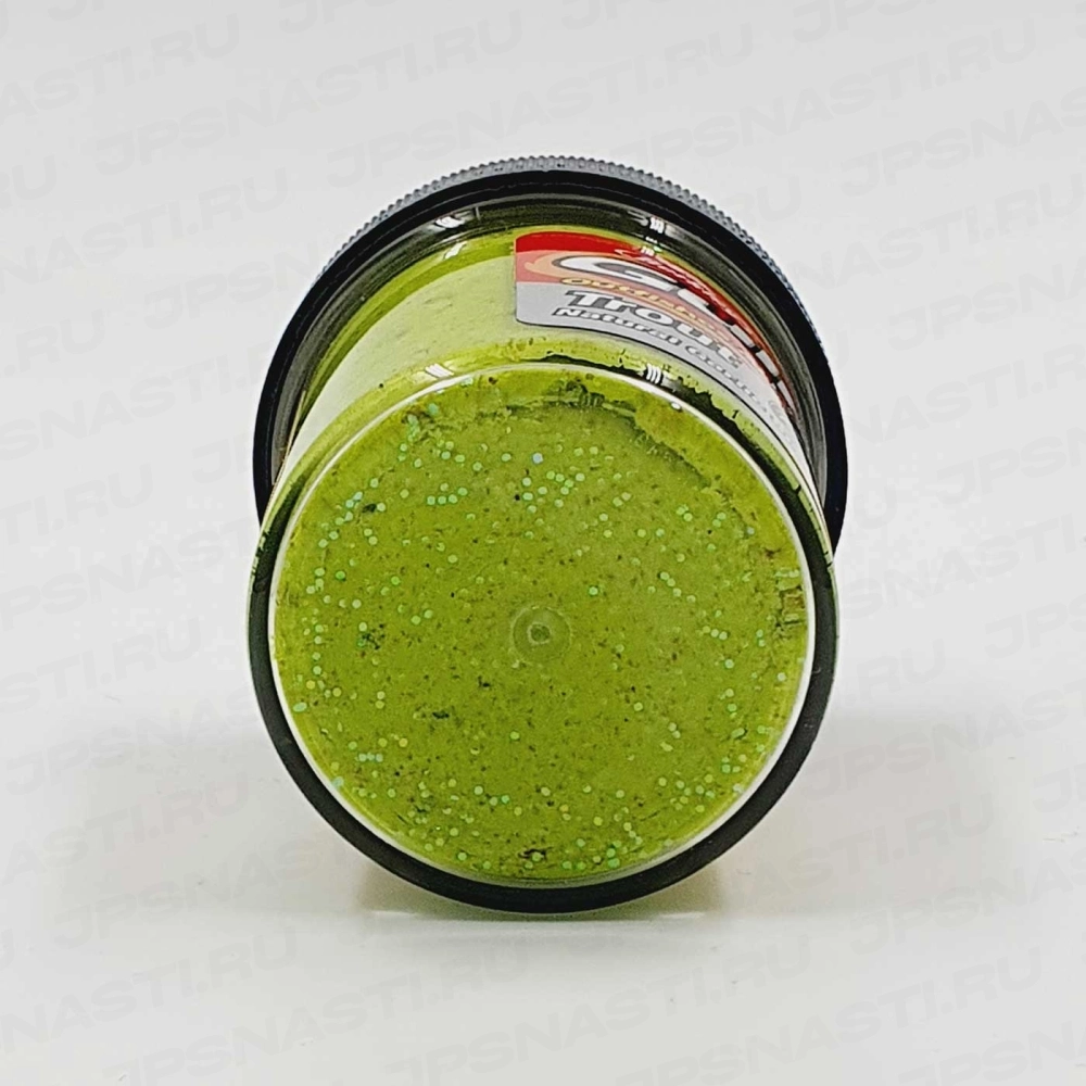 Узнать подробнее про - Паста форелевая Berkley Gulp! Dough Natural Scent, ярко-светло-зеленая с блестками, чеснок.