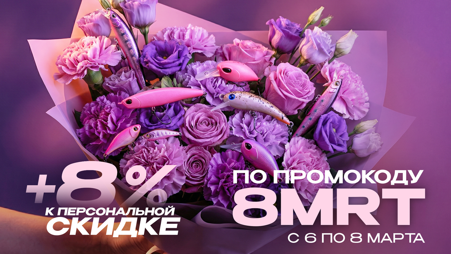 Компания “Японские снасти” совместно с интернет-магазином JPSNASTI.RU от всей души поздравляют прекрасную половину человечества с главным праздником весны - 8 Марта, Международным женским днем! Дорогие девушки, мы искренне желаем вам много любви, счастья, весеннего настроения, вечной красоты, обаяния и исполнения всех желаний. Оставайтесь такими же прекрасными, женственными и лучезарными, чтобы улыбка никогда не сходила с ваших лиц! Несмотря на то, что 8 марта - женский праздник, мы хотим сделать подарок абсолютно всем клиентам нашего рыболовного магазина! Воспользуйтесь новым ПРОМОКОДОМ "8MRT" и получите +8% к своей персональной скидке как при покупке в шоу-руме, так и при заказе товаров в интернет-магазине. Максимальная СКИДКА с учетом нашей программы лояльности в период действия ПРОМОКОДА составит 23%. Срок действия промокода: c 21:00 6 марта по 23:59 8 марта. Обращаем ваше внимание: