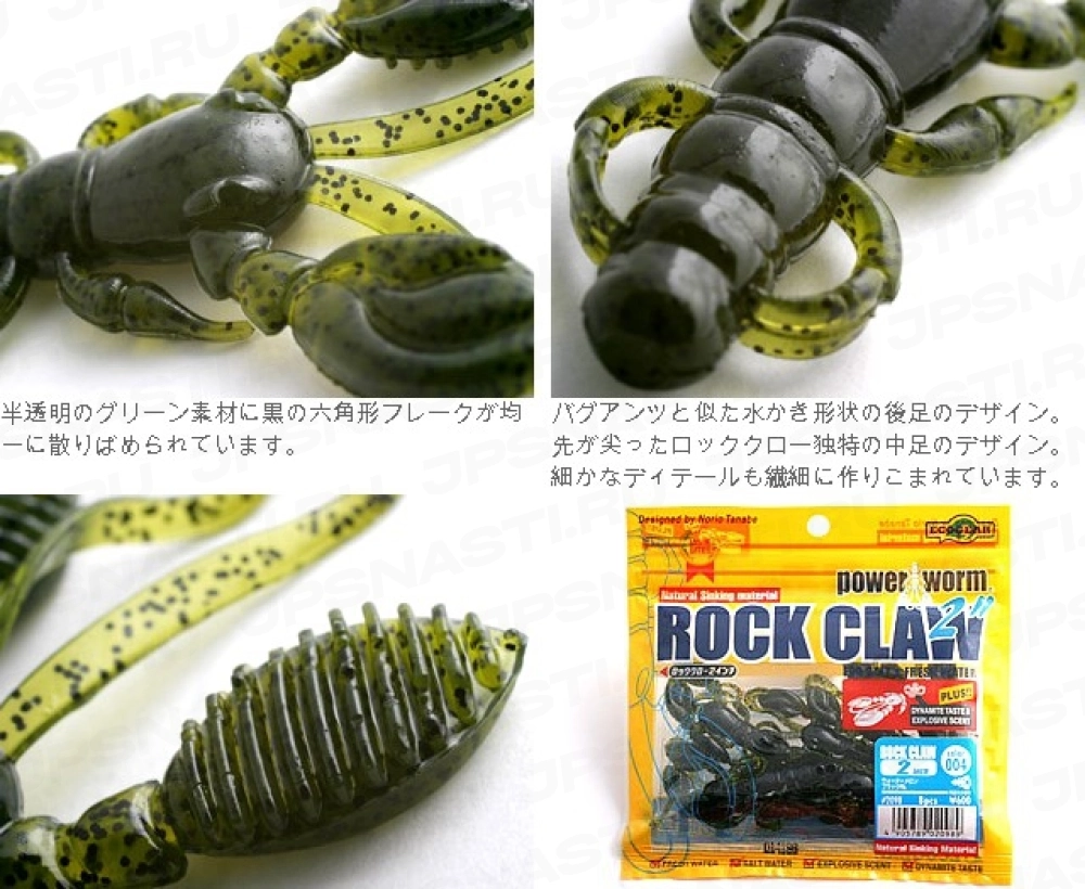 Ecogear Rock Claw - съедобный силиконовый рак с массивными клешнями. Эти клешни вместе с длинными усами создают мощные вибрации при проводке. При падении клешни касаются дна чуть позже тела, что придает приманке очень натуральный вид.