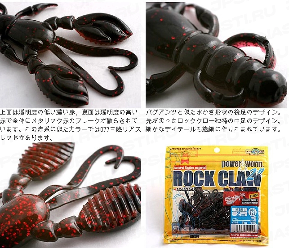 Ecogear Rock Claw - съедобный силиконовый рак с массивными клешнями. Эти клешни вместе с длинными усами создают мощные вибрации при проводке. При падении клешни касаются дна чуть позже тела, что придает приманке очень натуральный вид.