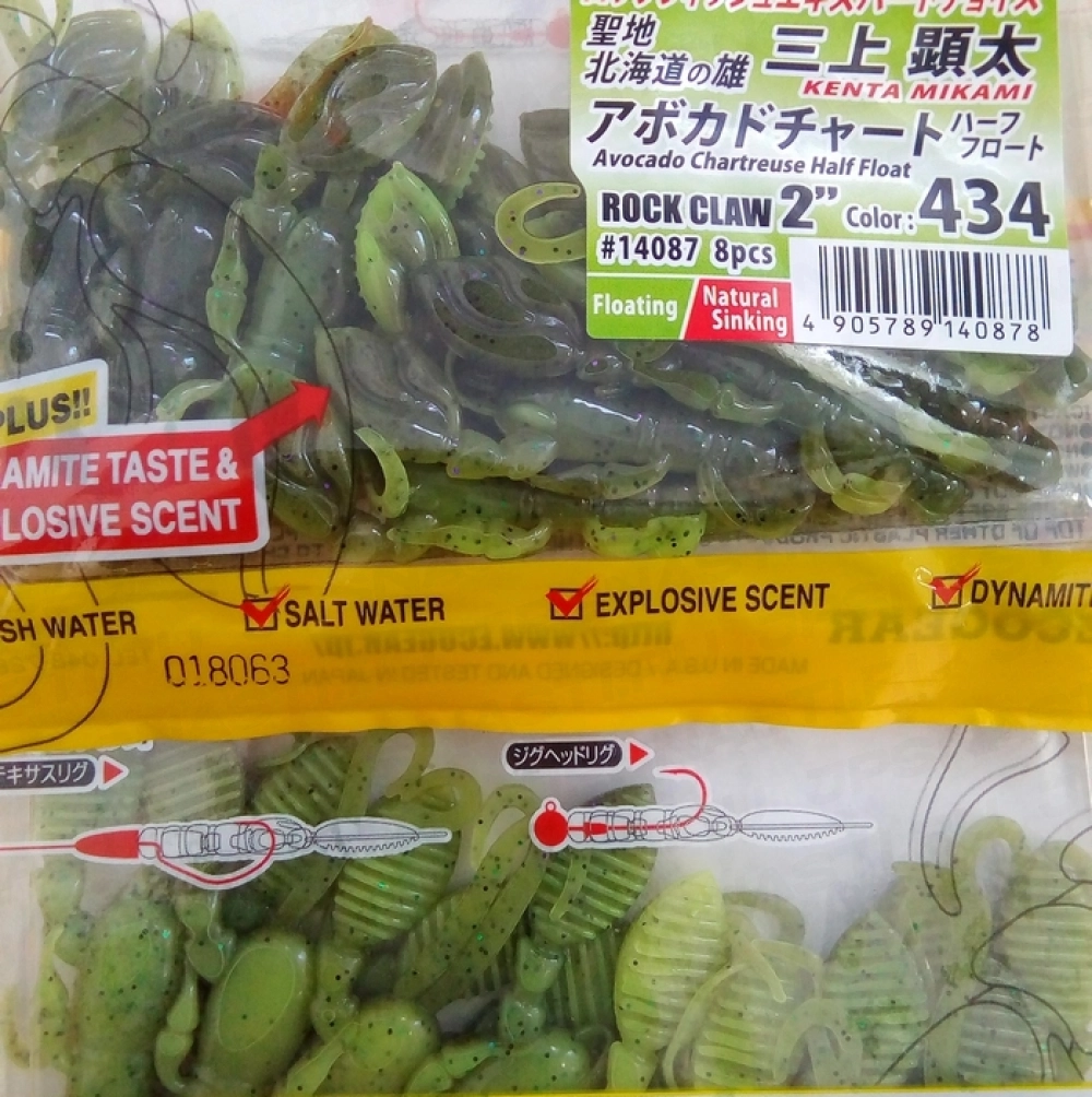 Ecogear Rock Claw - съедобный силиконовый рак с массивными клешнями. Эти клешни вместе с длинными усами создают мощные вибрации при проводке. При падении клешни касаются дна чуть позже тела, что придает приманке очень натуральный вид.